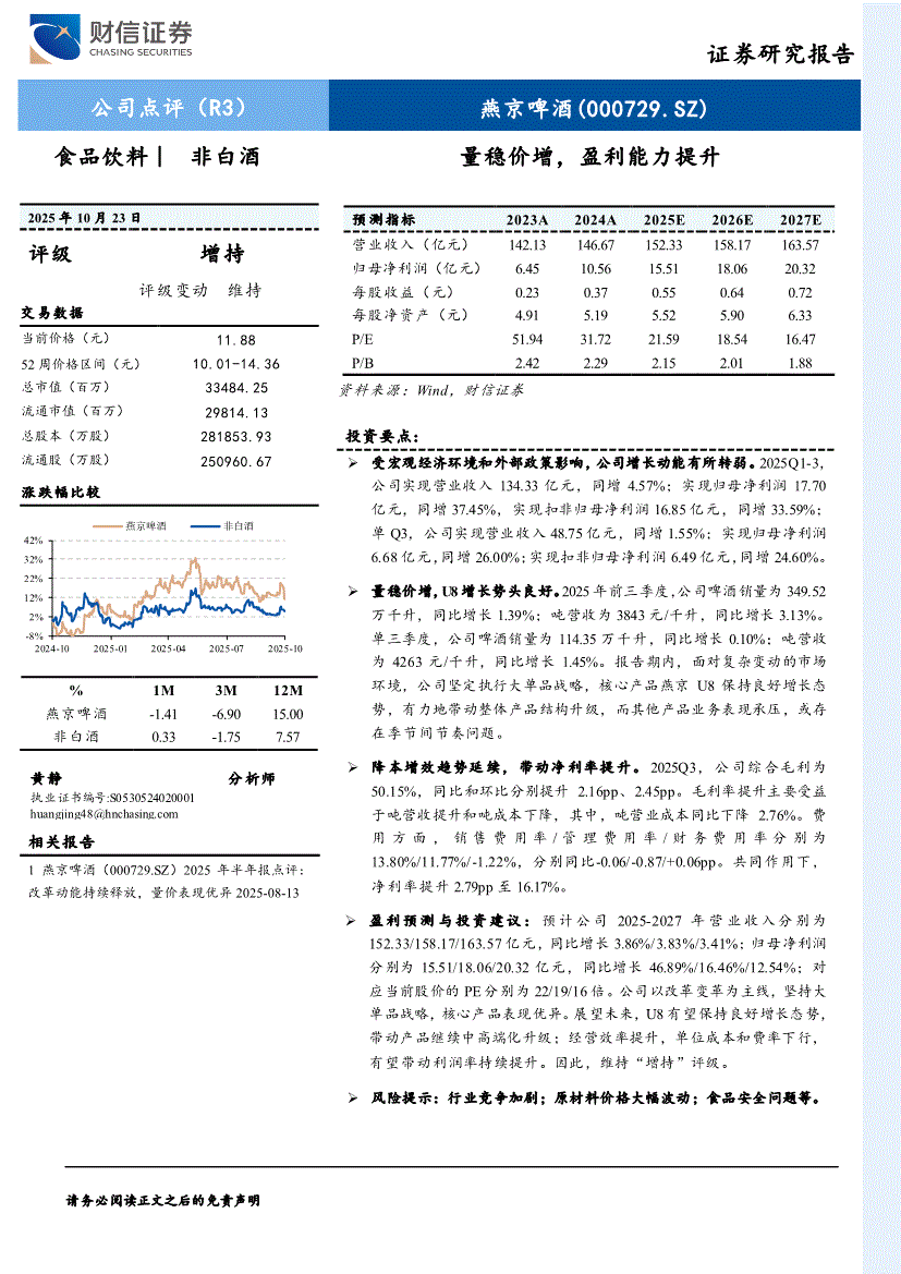燕京啤酒:财信证券-燕京啤酒-000729-量稳价增,盈利能力提升-251023