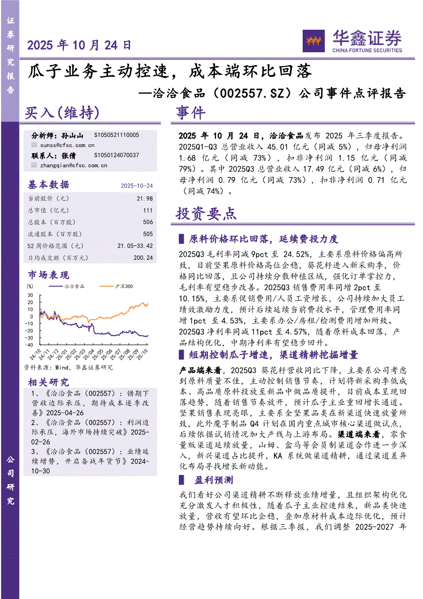 洽洽食品:华鑫证券-洽洽食品-002557-公司事件点评报告:瓜子业务主动控速,成本端环比回落-251024