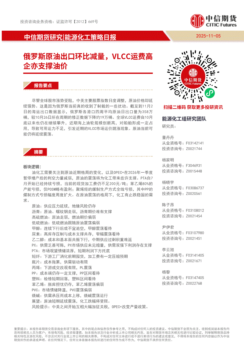 中信期货-能源化工策略日报:俄罗斯原油出口环比减量,VLCC运费高企亦支撑油价-251105