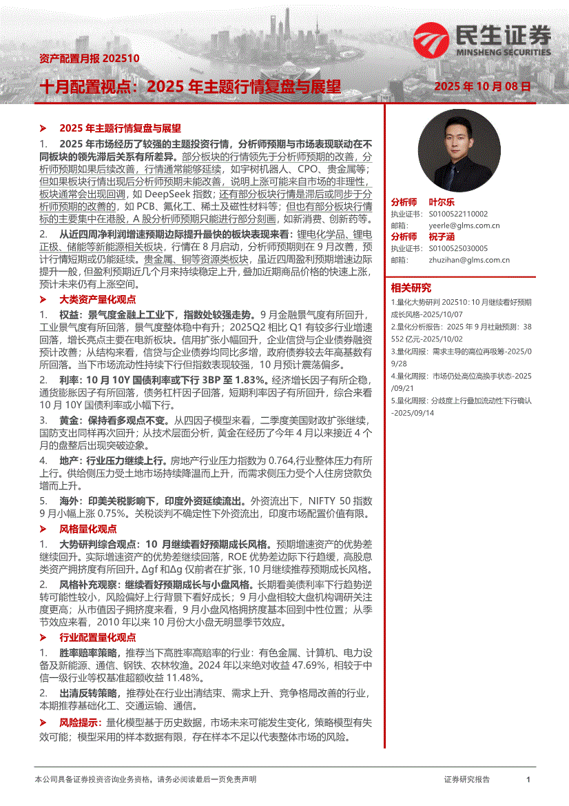 民生证券-资产配置月报:十月配置视点,2025年主题行情复盘与展望-251008