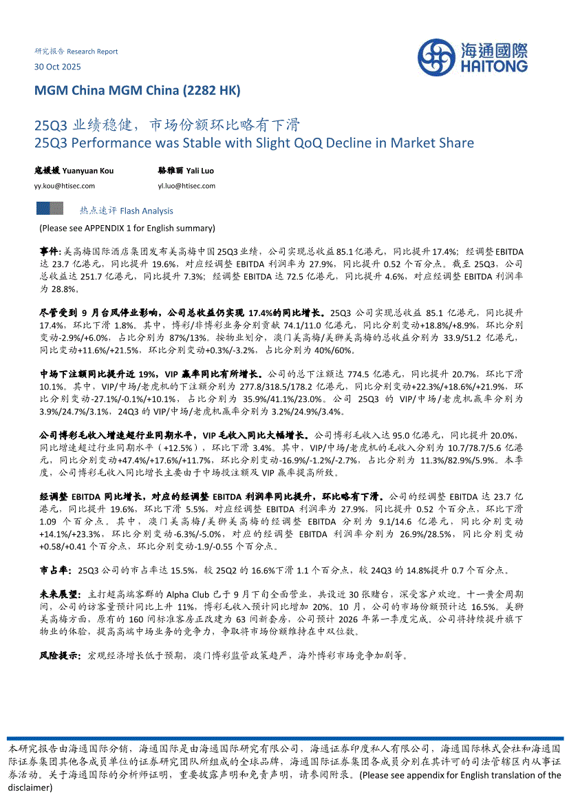 MGM China MGM China:海通国际-MGM China MGM China-2282.HK-25Q3业绩稳健,市场份额环比略有下滑-251030