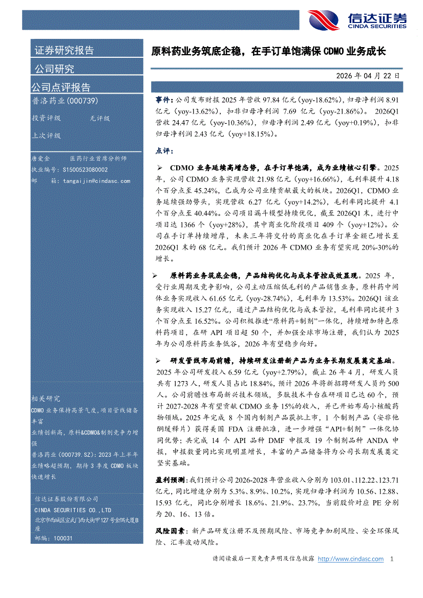 普洛药业:信达证券-普洛药业-000739-原料药业务筑底企稳,在手订单饱满保CDMO业务成长-260422