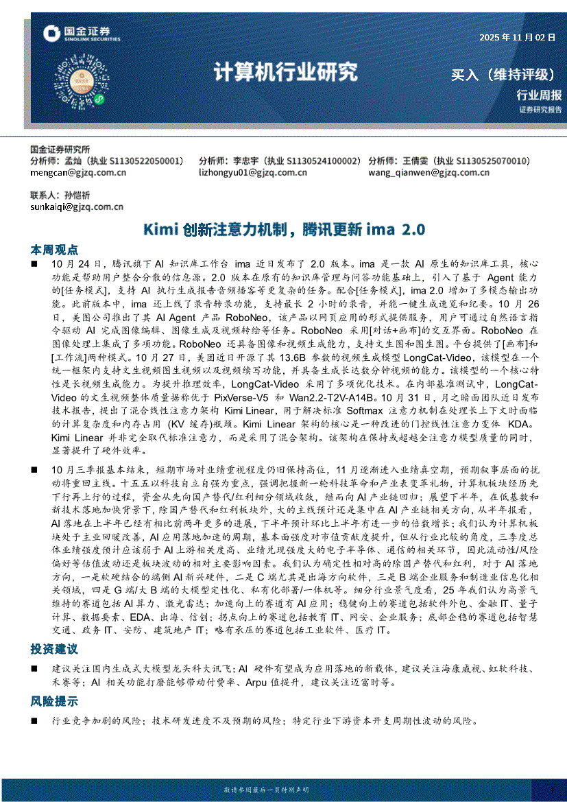 计算机行业:国金证券-计算机行业周报:Kimi创新注意力机制,腾讯更新ima2.0-251102