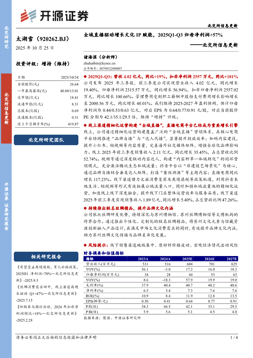 太湖雪:开源证券-太湖雪-920262-北交所信息更新:全域直播驱动增长文化IP赋能,2025Q1~Q3归母净利润+57%-251025