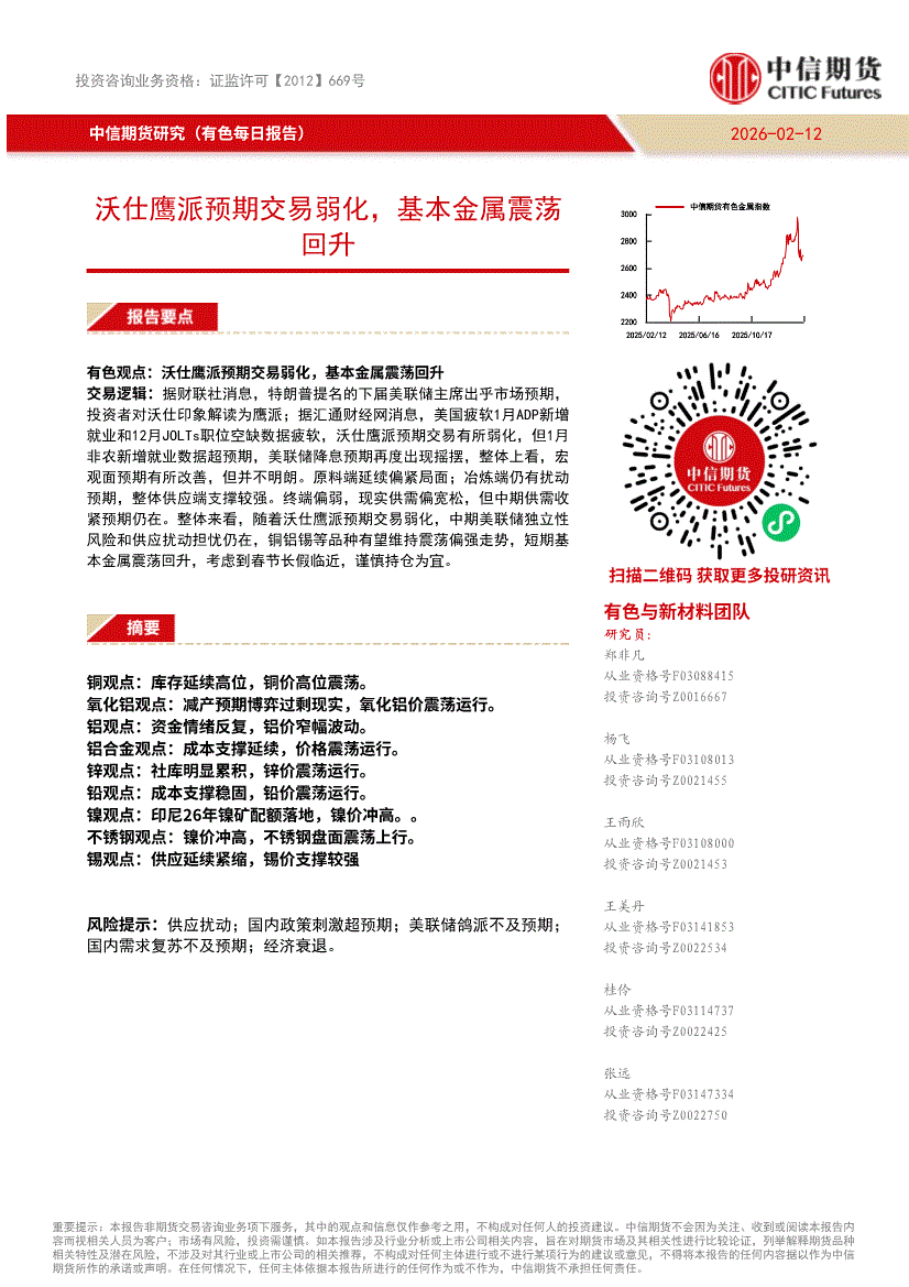 中信期货-有色每日报告:沃仕鹰派预期交易弱化,基本金属震荡回升-260212