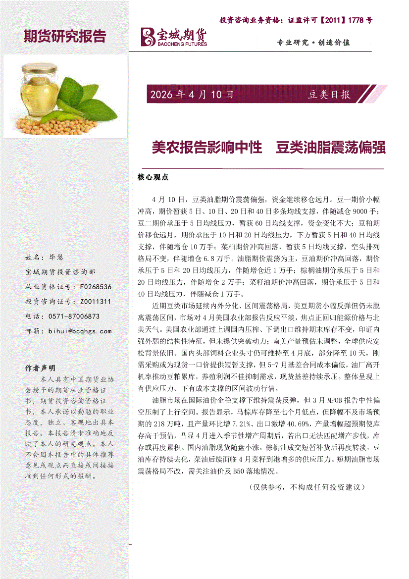 宝城期货-豆类日报:美农报告影响中性,豆类油脂震荡偏强-260410