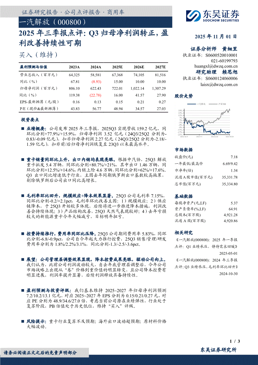 一汽解放:东吴证券-一汽解放-000800-2025年三季报点评:Q3归母净利润转正,盈利改善持续性可期-251101