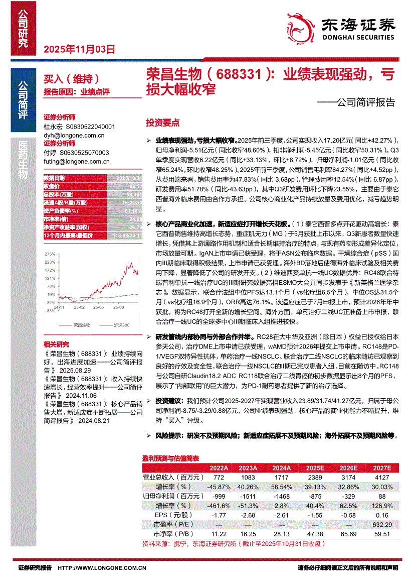 荣昌生物:东海证券-荣昌生物-688331-公司简评报告:业绩表现强劲,亏损大幅收窄-251103