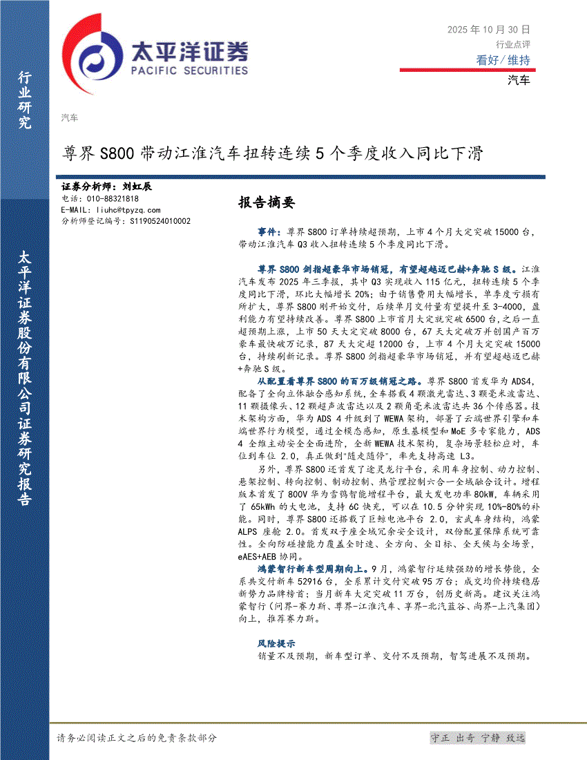 汽车行业:太平洋证券-汽车行业:尊界s800带动江淮汽车扭转连续5个季度收入同比下滑-251030