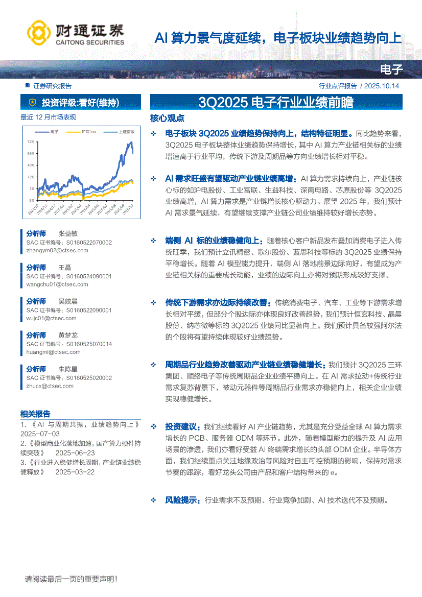 电子行业:财通证券-3Q2025 电子行业业绩前瞻 :AI算力景气度延续,电子板块业绩趋势向上-251014