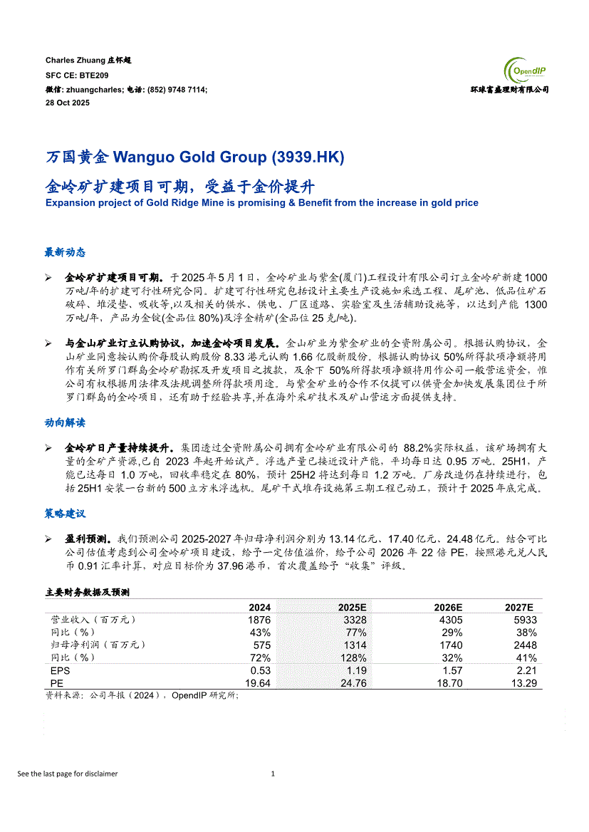万国黄金:环球富盛-万国黄金-3939.HK-金岭矿扩建项目可期,受益于金价提升-251028