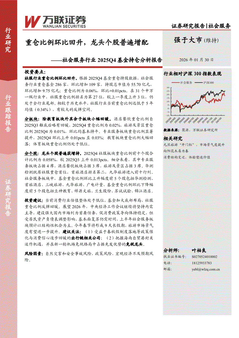 社会服务行业:万联证券-社会服务行业2025Q4基金持仓分析报告:重仓比例环比回升,龙头个股普遍增配-260130
