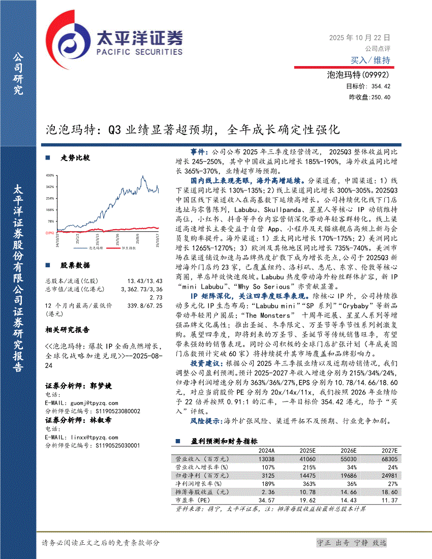 泡泡玛特:太平洋证券-泡泡玛特-9992.HK-Q3业绩显著超预期,全年成长确定性强化-251022