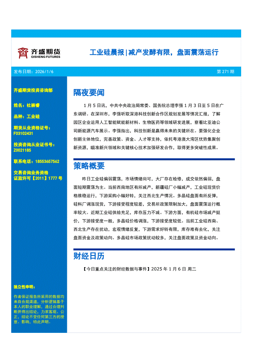 齐盛期货-工业硅晨报:减产发酵有限,盘面震荡运行-260106