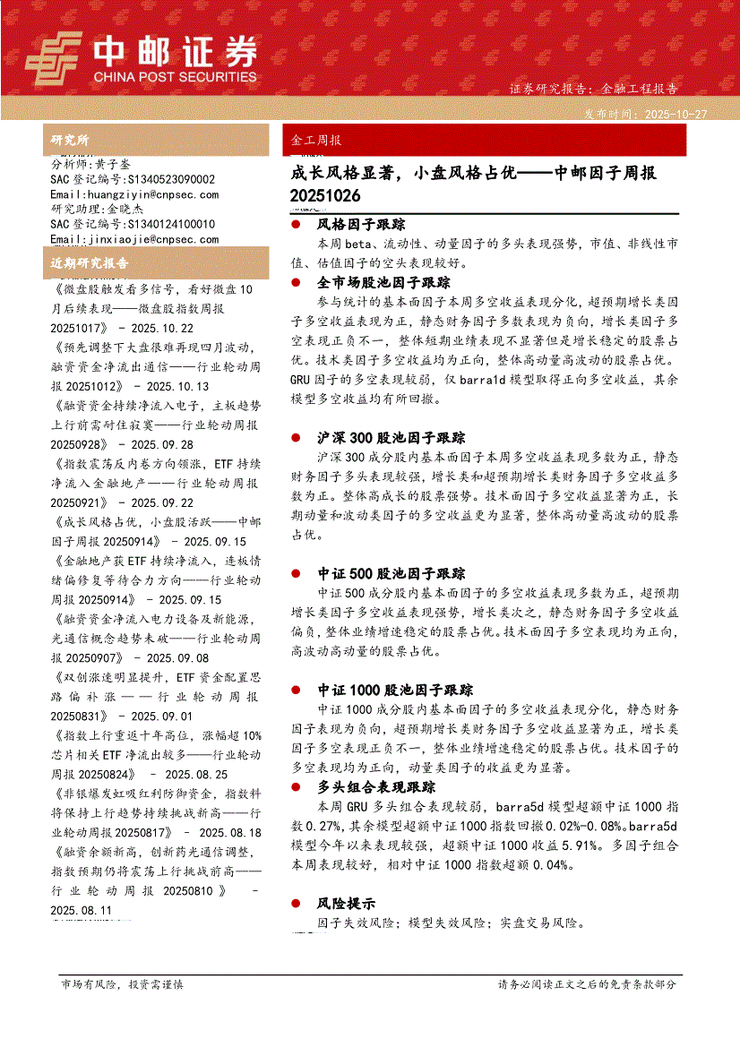 中邮证券-因子周报:成长风格显著,小盘风格占优-251027