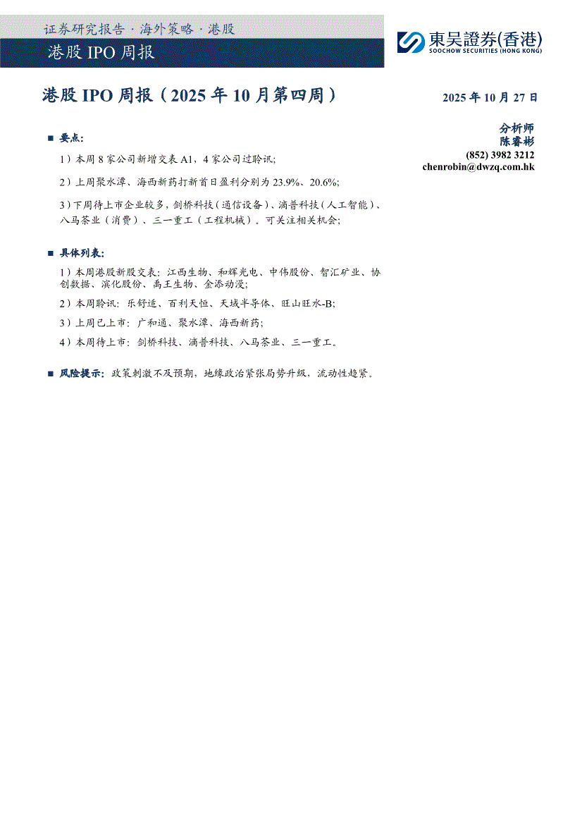 东吴证券(香港)-港股IPO周报(2025年10月第四周)-251027