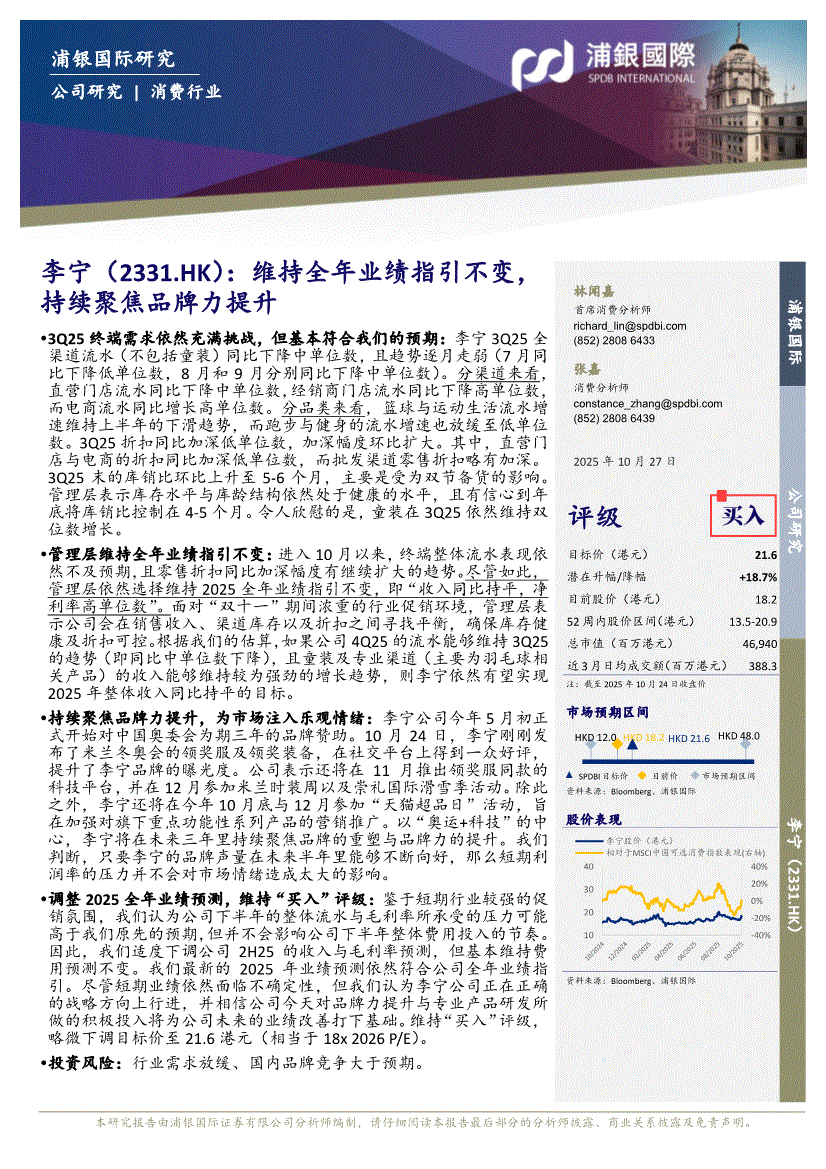 李宁:浦银国际-李宁-2331.HK-维持全年业绩指引不变,持续聚焦品牌力提升-251027
