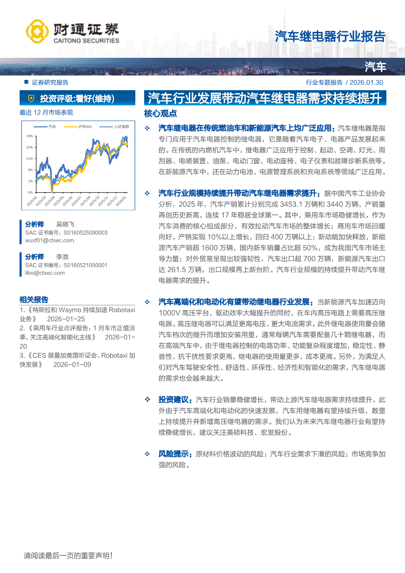 汽车行业:财通证券-汽车继电器行业报告:汽车行业发展带动汽车继电器需求持续提升-260130