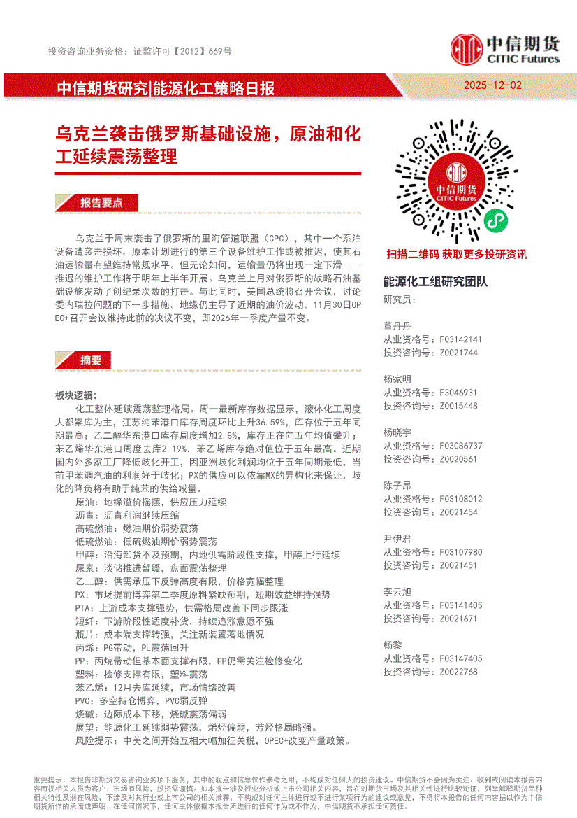 中信期货-能源化工策略日报:乌克兰袭击俄罗斯基础设施,原油和化工延续震荡整理-251202
