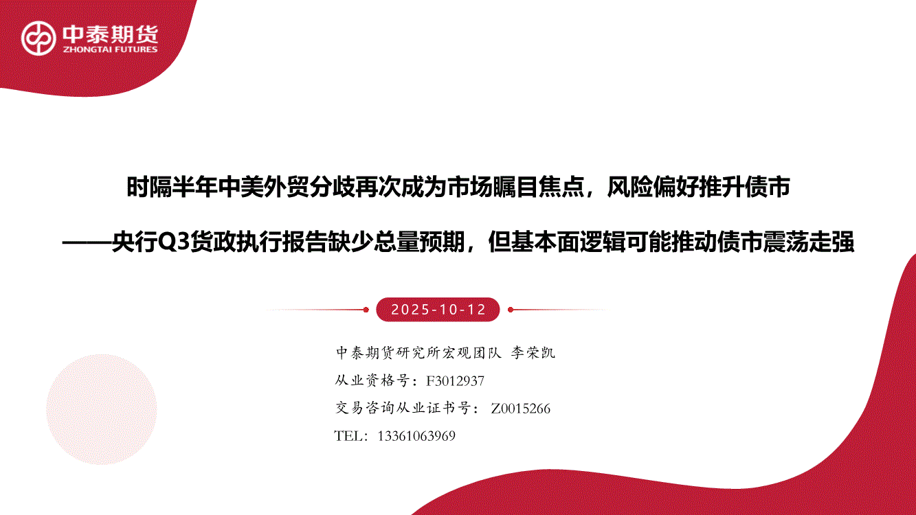 中泰期货-时隔半年中美外贸分歧再次成为市场瞩目焦点,风险偏好推升债市,央行Q3货政执行报告缺少总量预期,但基本面逻辑可能推动债市震荡走强-251012