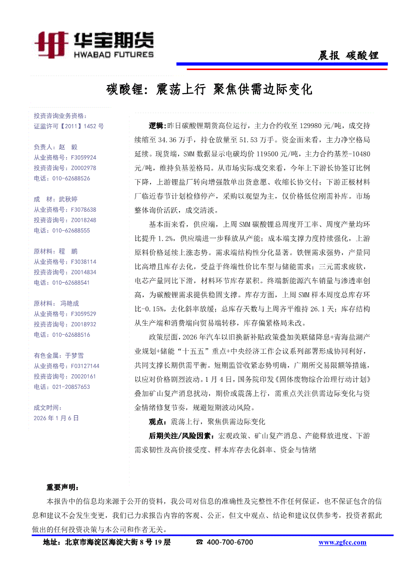 华宝期货-碳酸锂晨报:震荡上行,聚焦供需边际变化-260106