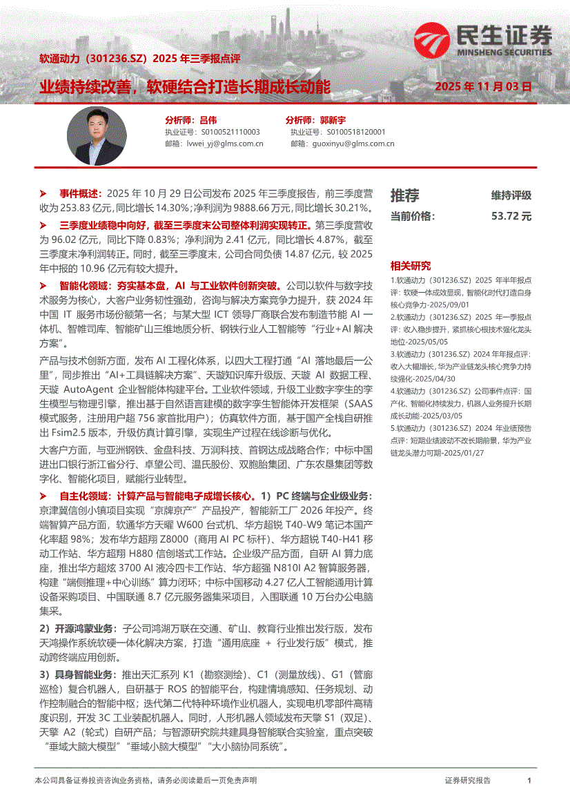 软通动力:民生证券-软通动力-301236-2025年三季报点评:业绩持续改善,软硬结合打造长期成长动能-251103
