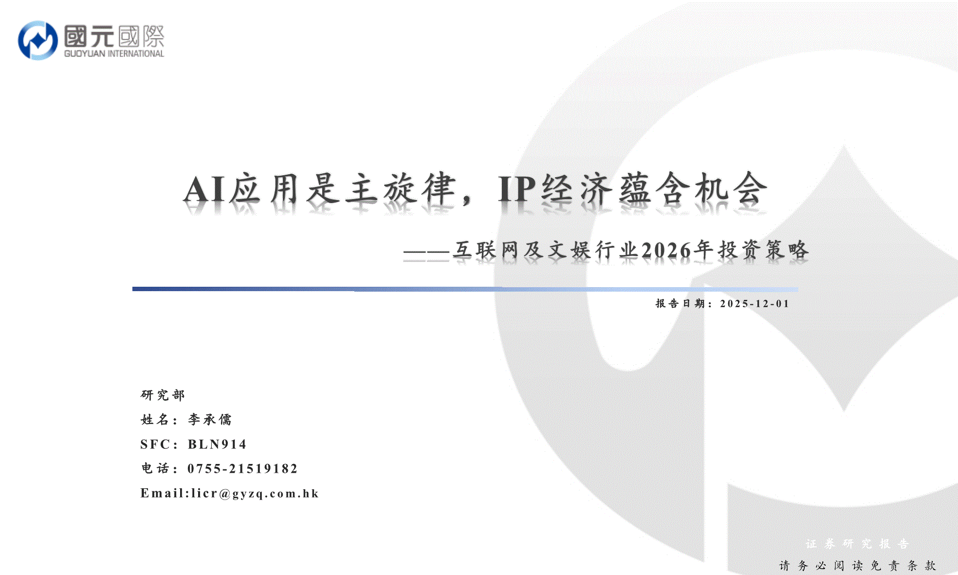 互联网及文娱行业:国元国际-互联网及文娱行业2026年投资策略:AI应用是主旋律,IP经济蕴含机会-251201
