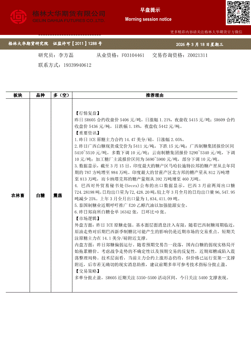 格林大华期货-早盘提示:白糖红枣橡胶-260318