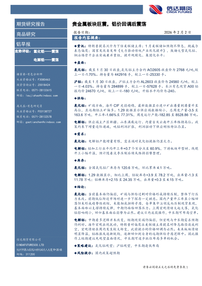 信达期货-铝早报:贵金属板块巨震,铝价回调后震荡-260202