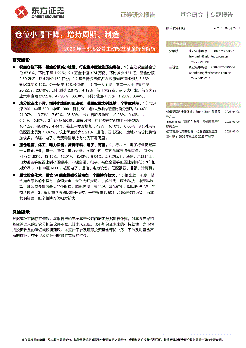 东方证券-2026年一季度公募主动权益基金持仓解析:仓位小幅下降,增持周期、制造-260424