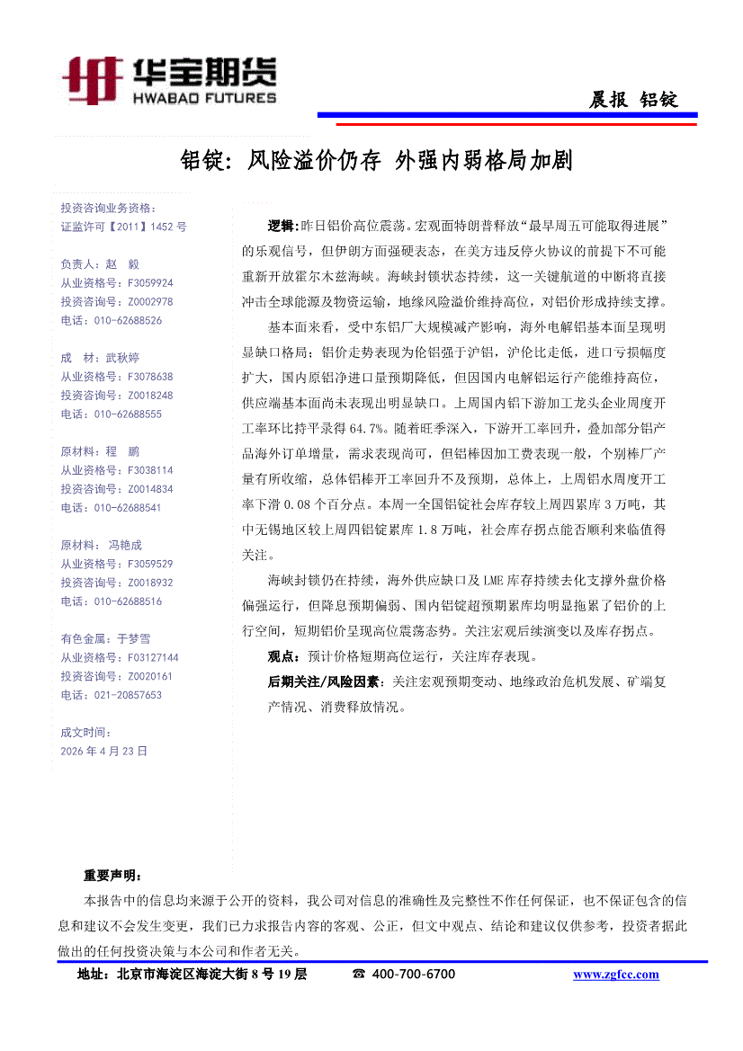 华宝期货-铝锭晨报:风险溢价仍存,外强内弱格局加剧-260423