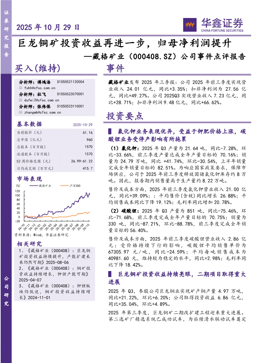 藏格矿业:华鑫证券-藏格矿业-000408-公司事件点评报告:巨龙铜矿投资收益再进一步,归母净利润提升-251029