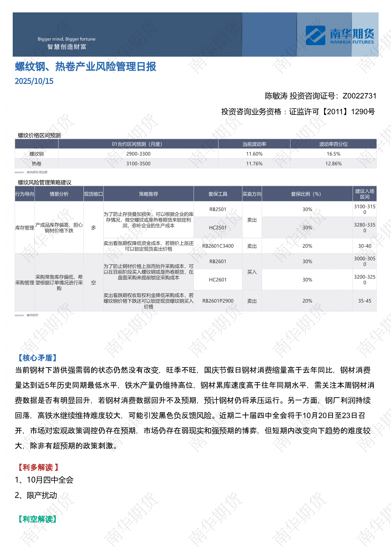 南华期货-螺纹钢、热卷产业风险管理日报-251015