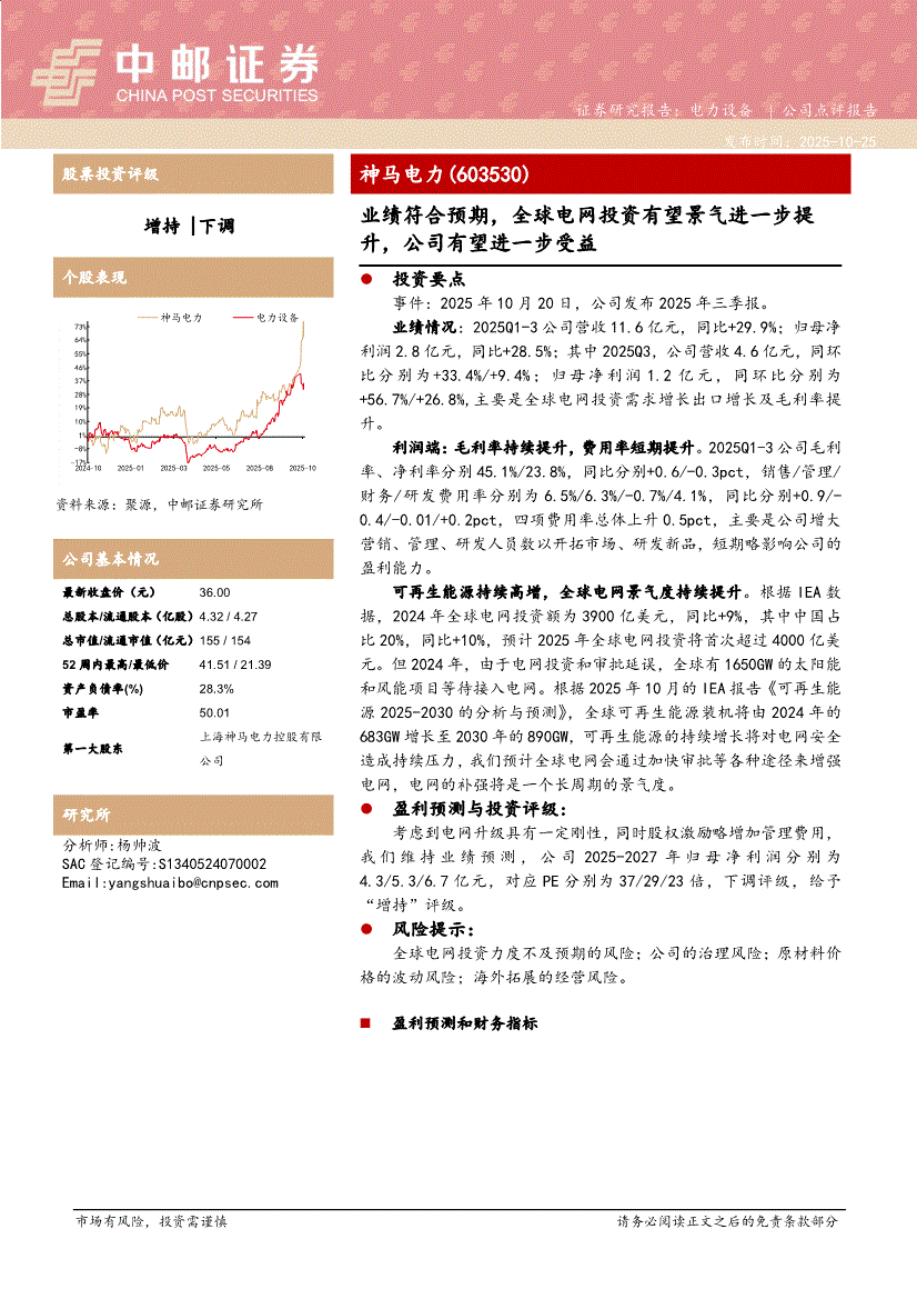 神马电力:中邮证券-神马电力-603530-业绩符合预期,全球电网投资有望景气进一步提升,公司有望进一步受益-251025