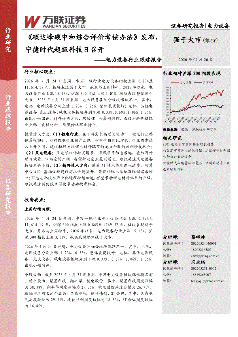 电力设备行业:万联证券-电力设备行业跟踪报告:《碳达峰碳中和综合评价考核办法》发布,宁德时代超级科技日召开-260426