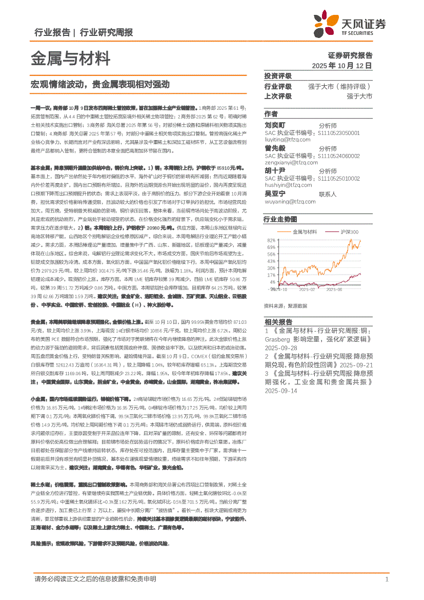 金属与材料行业:天风证券-金属与材料行业研究周报:宏观情绪波动,贵金属表现相对强劲-251012
