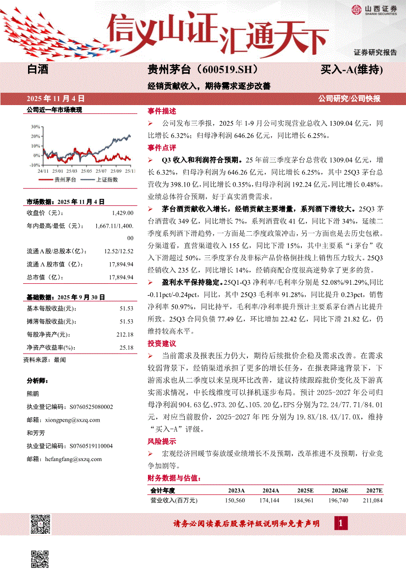 贵州茅台:山西证券-贵州茅台-600519-经销贡献收入,期待需求逐步改善-251104
