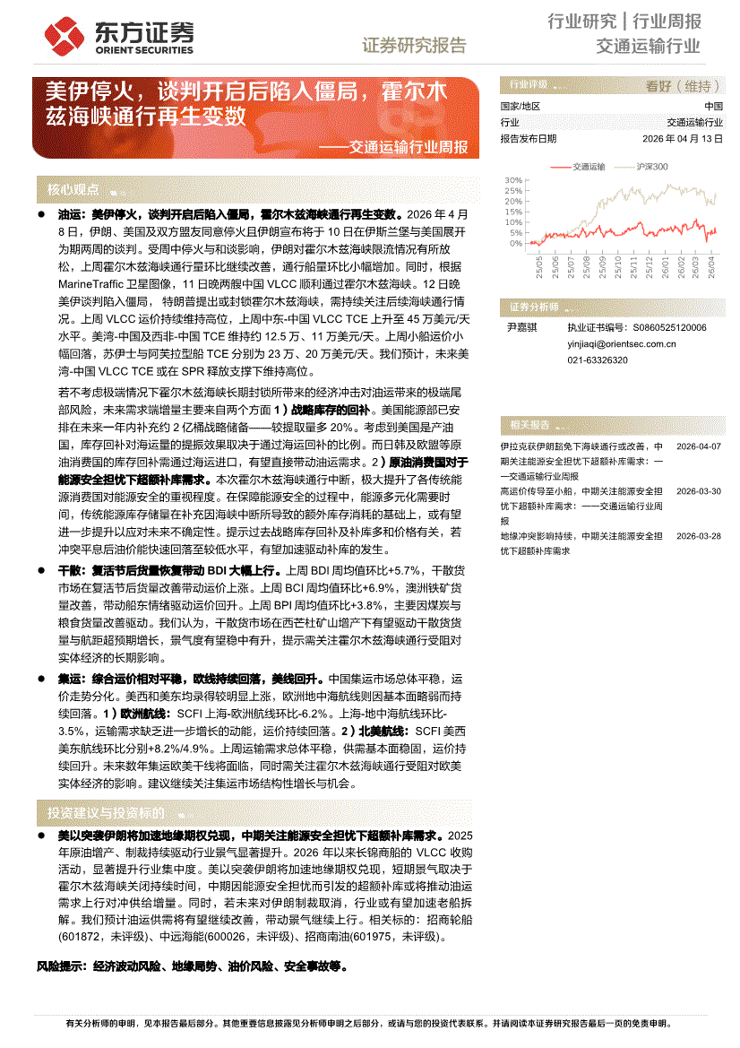 交通运输行业:东方证券-交通运输行业周报:美伊停火,谈判开启后陷入僵局,霍尔木兹海峡通行再生变数-260413
