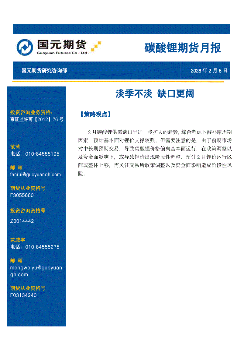国元期货-碳酸锂期货月报:淡季不淡,缺口更阔-260206
