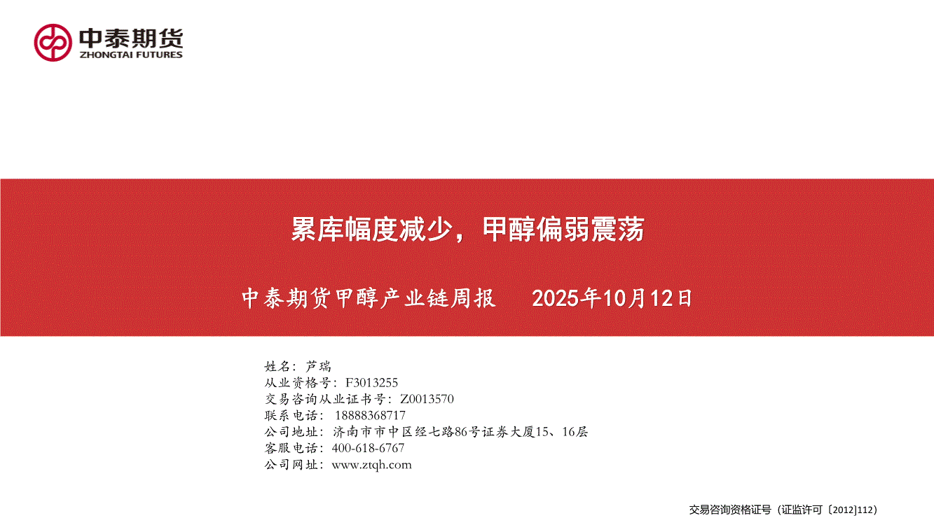 中泰期货-甲醇产业链周报:累库幅度减少,甲醇偏弱震荡-251012