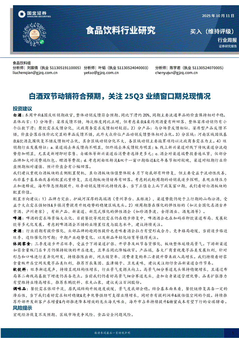 食品饮料行业:国金证券-食品饮料行业周报:白酒双节动销符合预期,关注25Q3业绩窗口期兑现情况-251011
