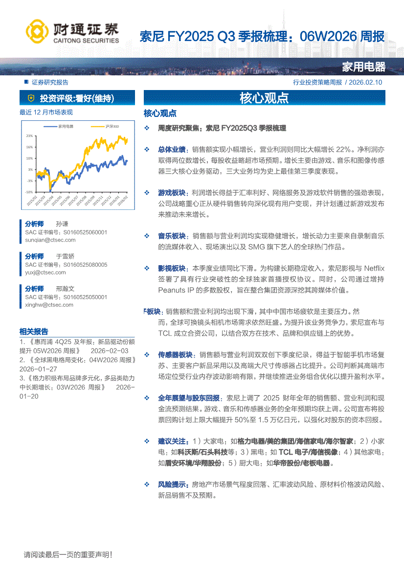 家用电器行业:财通证券-家用电器行业:索尼FY2025 Q3季报梳理,06W2026周报-260210