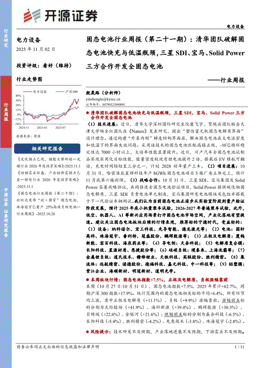 固态电池行业:开源证券-固态电池行业周报(第二十一期):清华团队破解固态电池快充与低温瓶颈,三星SDI、宝马、Solid Power三方合作开发全固态电池-251102