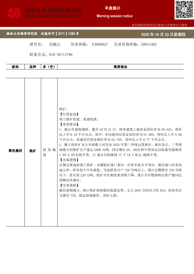 格林大华期货-早盘提示:铁矿-251023