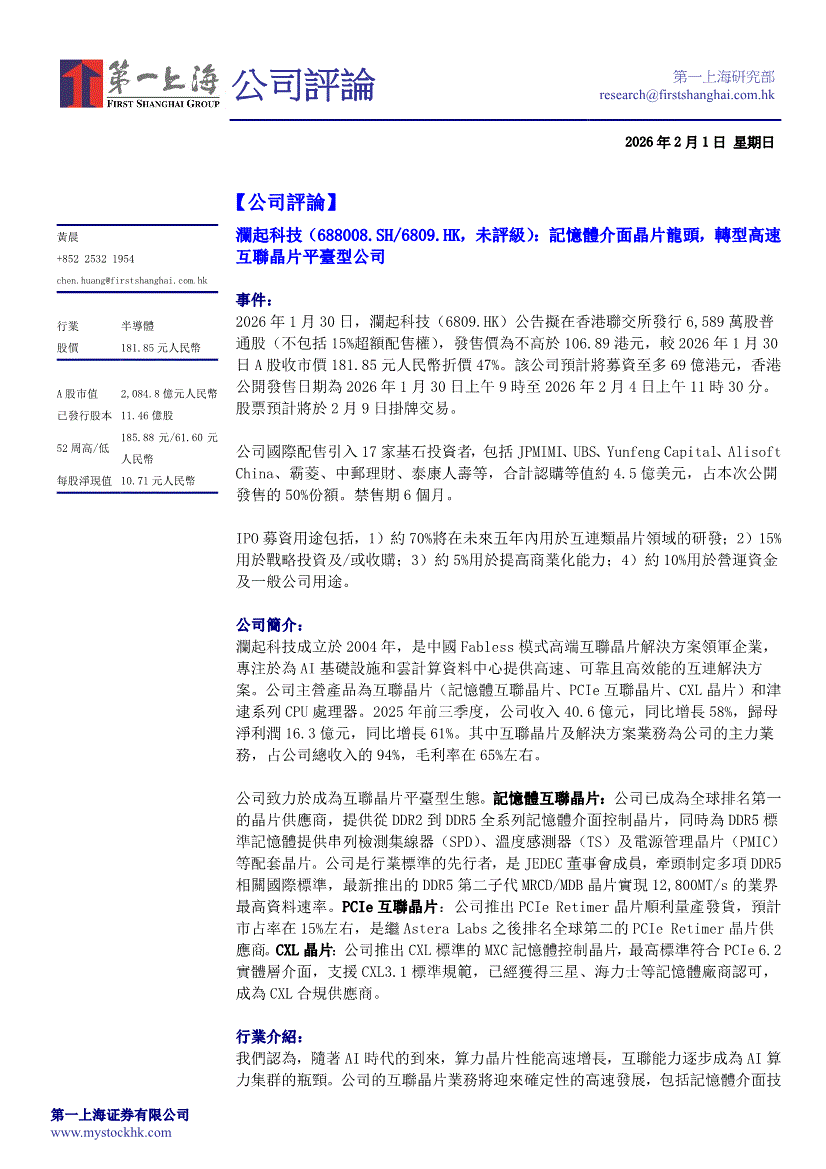 澜起科技:第一上海-澜起科技-688008-记忆体介面晶片龙头,转型高速互联晶片平台型公司-260201