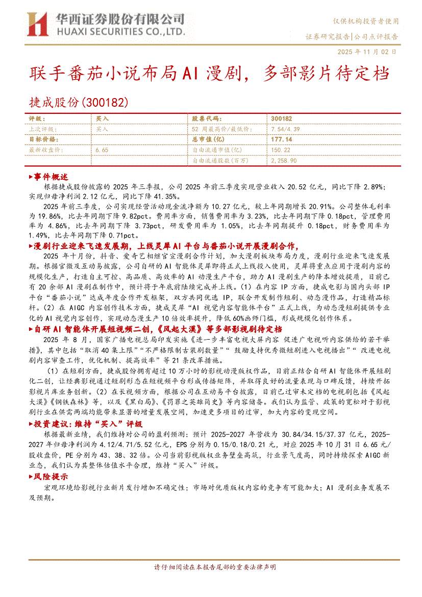 捷成股份:华西证券-捷成股份-300182-联手番茄小说布局AI漫剧,多部影片待定档-251102