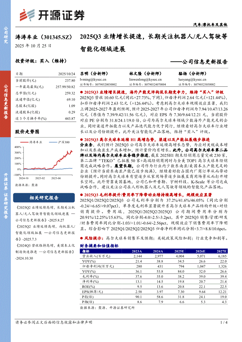 涛涛车业:开源证券-涛涛车业-301345-公司信息更新报告:2025Q3业绩增长提速,长期关注机器人/无人驾驶等智能化领域进展-251025