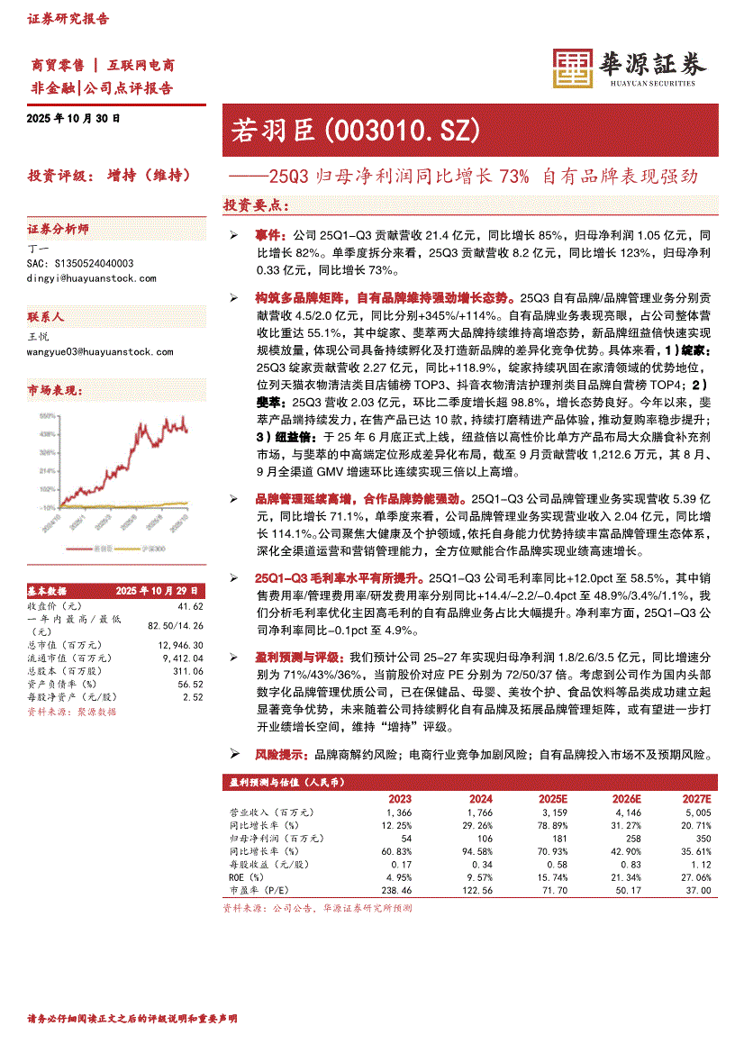 若羽臣:华源证券-若羽臣-003010-25Q3归母净利润同比增长73%自有品牌表现强劲-251030