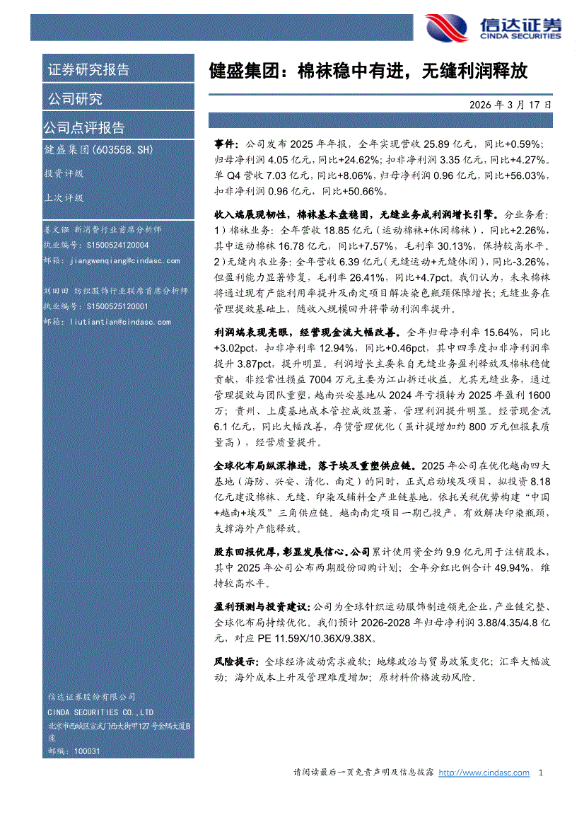 健盛集团:信达证券-健盛集团-603558-棉袜稳中有进,无缝利润释放-260317