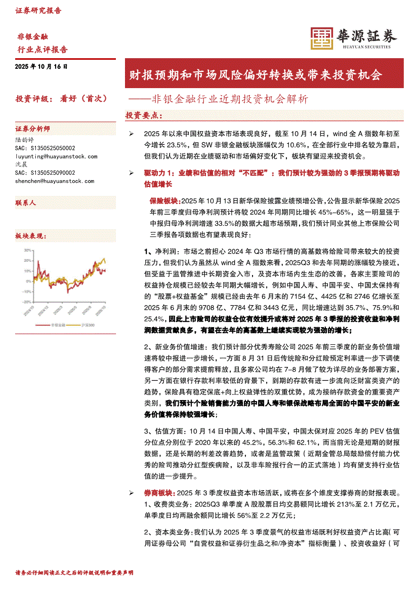 非银金融行业:华源证券-非银金融行业近期投资机会解析:财报预期和市场风险偏好转换或带来投资机会-251016